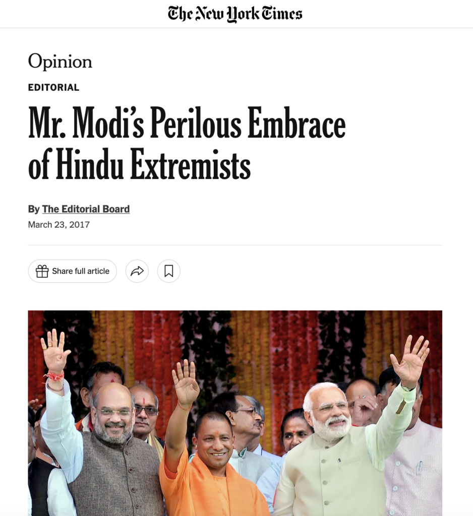 लेकिन देशी विदेशी मीडिया की सीएम योगी से घृणा किसी से छुपी नहीं है। विदेशी मीडिया ने योगी आदित्यनाथ की मुख्यमंत्री पद पर नियुक्ति के समय से आज तक उन पर हमला ही किया है, चाहे न्यूयॉर्क टाइम्स हो, या फिर बीबीसी ।