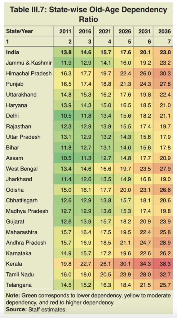 तो RBI की रिपोर्ट ने कहा है कि इस समय केरल का डिपेंडेंसी रेशियो 30 है और 2036 तक ये बढ़ कर 38 हो जाएगा। यानी 2036 में केरल के हर 100 युवाओं को 38 बुजुर्गों को सपोर्ट करना होगा।