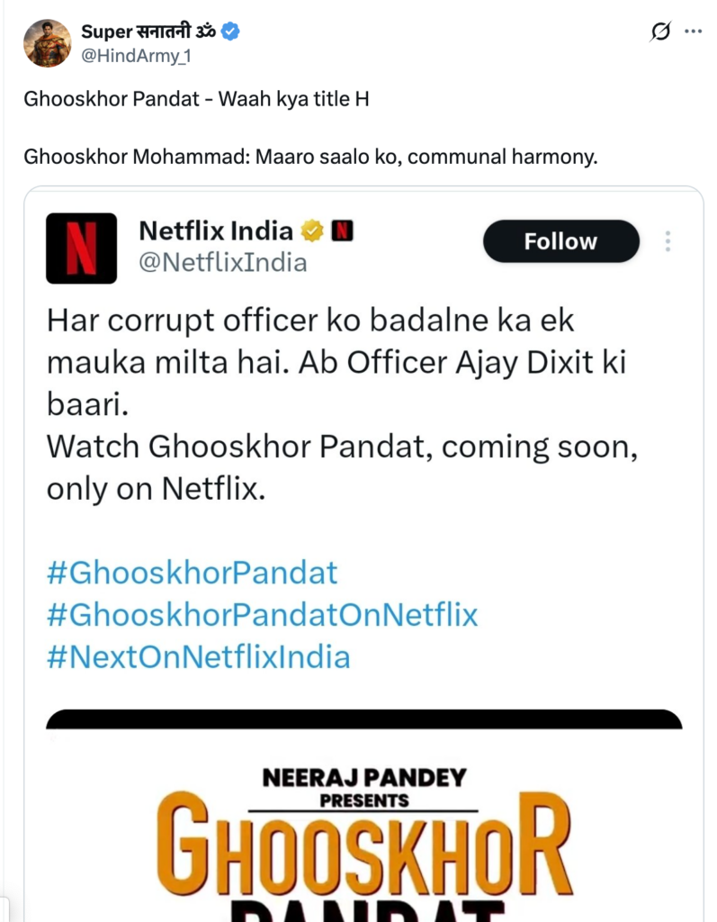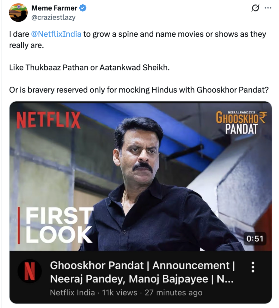पिछले 24 घंटे में सोशल मीडिया पर एक Hashtag खूब वायरल हो रह है – #ghooskhorpandat। असल में नेटफ़्लिक्स पर घूसखोर पंडित नाम से एक फ़िल्म रिलीज़ होने वाली है जिसे नीरज पांडे ने बनाया है और इसमें मुख्य किरदार हैं मनोज वाजपेयी। इस फ़िल्म के नाम से ही आप समझ सकते हैं कि नेटफ़्लिक्स इंडिया ने बड़े चालकी से ब्राह्मणों के ख़िलाफ़ प्रोपेगेंडा करने का प्रयास किया है।