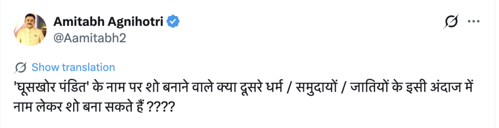 लेकिन यह मामला केवल जातिवाद तक सीमित नहीं है। असल में नेटफ़्लिक्स इंडिया का सनातन विरोधी एजेंडा है जो वह बॉलीवुड के साथ मिलकर भारत में चला रहा है। पहले ब्राह्मणों को गरीब दिखाया जाता था, उसके बाद ब्राह्मणों को चोर बताया गया, फिर उसे शोषक, उत्पीड़क दिखाया गया।