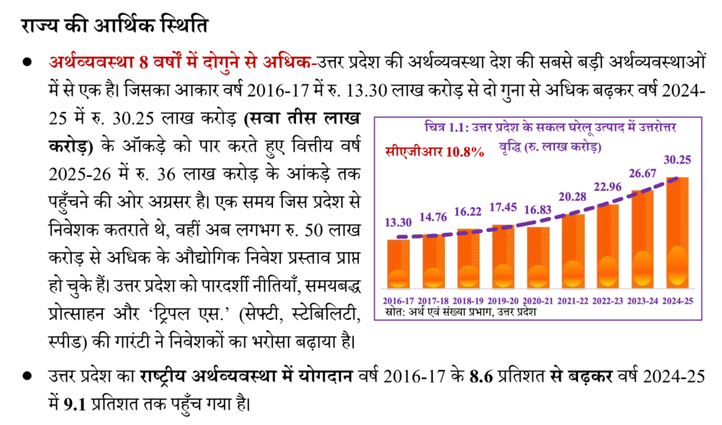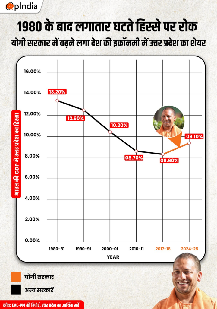 उत्तर प्रदेश का इकोनॉमिक सर्वे कहता है कि अब नेशनल GDP में यूपी का शेयर बढ़ने लगा है, सर्वे कहता है कि यूपी का शेयर नेशनल GDP में 2017-18 में 8.6% था और अब 2024-25 में बढ़ कर ये 9.1% हो गया है। लेकिन ये एक लाइन की डिटेल पूरी कहानी नहीं बताती।