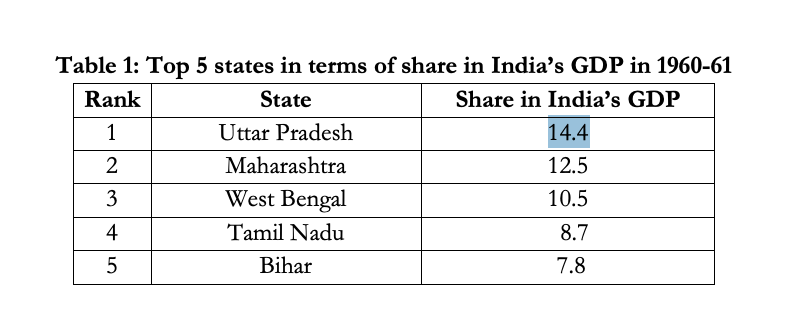 EAC-PM की मेंबर शमिका रवि का एक रिसर्च पेपर बताता है कि 1960s में यूपी का नेशनल GDP में शेयर 14.4% था, और यूपी इस कंट्री की सबसे बड़ी इकॉनमी था। लेकिन इसके बाद लगातार बाक़ी स्टेट्स आगे बढ़ते गए और यूपी पिछड़ता गया। एक के बाद एक साल आता रहा और उत्तर प्रदेश का शेयर नेशनल इकोनॉमी में कम होता रहा।
