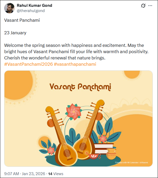 इस वर्ष बसंत पंचमी 23 जनवरी 2026 को मनाई जा रही है। यह पर्व ज्ञान, संगीत, कला और बुद्धि की देवी माँ सरस्वती को समर्पित प्रमुख हिंदू उत्सव है। माघ मास के शुक्ल पक्ष की पंचमी तिथि को आने वाली यह तिथि सरस्वती जयंती भी कहलाती है।सोशल मीडिया पर इस पर्व को लेकर एक व्यापक गलतफहमी फैलाई जा रही है। बड़ी संख्या में लोग दावा करते हैं कि बसंत पंचमी के दिन ही वसंत ऋतु का आगमन होता है। कई पोस्ट्स में लिखा जा रहा है—“वसंत ऋतु का स्वागत करें”, “बसंत पंचमी वसंत ऋतु के आगमन की सूचना देती है” या “यह पर्व वसंत के आने और माँ सरस्वती की पूजा का प्रतीक है”।
